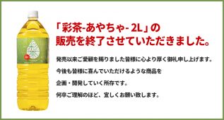 いつも当店をご利用いただきありがとうございます。 この度、誠に勝手ではございますが、 「彩茶-あやちゃ- 2L」 を販売終了させて頂くことになりました。 発売以来ご愛顧を賜りました皆様には、ご迷惑をおかけすることをお詫び申し上げますとともに、ご了承の程お願い申し上げます。 今後も皆様に喜んでいただけるような商品を企画・開発していく所存です。 何卒ご理解のほど...